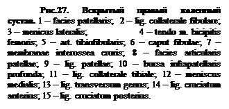 Коленный сустав, articulatio genus. В этом суставе (рис.27) сочленяются суставные поверхности трех костей: мыщелков бедренной и большеберцовой костей и надколенника. Это наиболее крупный, мощный и сложный сустав тела человека. Суставная капсула, тонкая и обширная, прикрепляется с некоторым отступом от краев всех суставных поверхностей. В суставе сосредоточено наибольшее количество вспомогательных элементов.