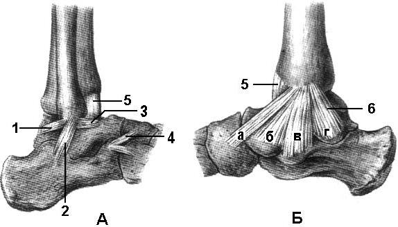 Капсула сустава с боковых поверхностей укрепляется связками. С медиальной стороны (рис.31) располагается медиальная (дельтовидная) связка, lig. mediale (deltoideum). Она берет начало от медиальной лодыжки, и ее волокна заканчиваются на ладьевидной, таранной и пяточной костях. В этой связке выделяют четыре части: