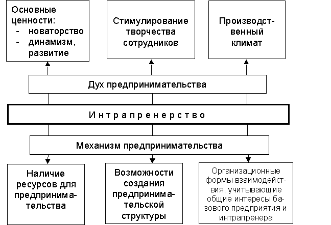 На предприятиях предпринимательского типа создается атмосфера поиска, поощряются выдвигаемые идеи, предложения и новые решения, имеется возможность превращения человека, выдвинувшего предпринимательскую идею, в совладельца предприятия, партнера, существуют и другие виды заинтересованности. Развитие духа интрапренерства обеспечивает эффективное развитие предприятия и позволяет преодолеть барьеры на пути его гибкого роста (рис. 1.7).