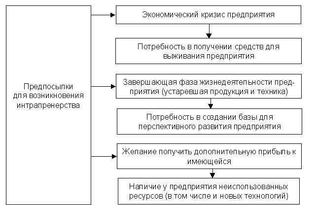 Возникновение интрапренерства было обусловлено объективными тенденциями социально-экономического развития общества. В социальной среде произошло удовлетворение базовых потребностей человека, связанных с его выживанием и физической безопасностью. Доминирующими для многих становятся социальные аспекты мотивации деятельности человека. Люди все больше стремятся к самостоятельной деятельности, к самовыражению. Они хотят реализовать эти желания, получить больше самостоятельности на своей работе в рамках ее организационной структуры. Недооценка этих желаний приводит к снижению интереса к работе, к снижению производительности, к уходу с работы в поисках возможности для самореализации и творчества. Следует отметить, что такое настроение свойственно наиболее способным и перспективным сотрудникам.