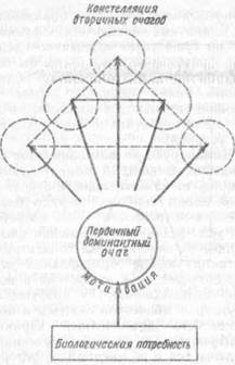 Рис. 21. Схема соотношения первичных и вторичных очагов при формировании доминирующей констелляции моягопых образований (по Л. С. Батуеву, 1986)
