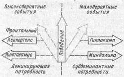 Все стимулы, поступающие из внешней среды, подразделяются по принципу вероятности: с высокой вероятностью их подкрепления и с низкой вероятностью подкрепления. Гипоталамус участвует в самых ранних стадиях организации поведения и на более поздних его этапах, когда оформляется внешне реализуемый эмоциональный ответ. Миндалина участвует в выборе поведения путем «взвешивания» конкурирующих эмоций, порожденных конкурирующими потребностями. Она вовлекается в процесс организации поведения на сравнительно поздних этапах, когда актуализированные потребности уже сопоставлены с возможностью их удовлетворения и порождены соответствующие эмоциональные состояния. Прогнозирование вероятности удовлетворения потребности осуществляется с участием преимущественно «информационных» мозговых структур — гиппо-кампа и фронтальных отделов неокор-текс а. Одн а ко есл и ги п i юка м п необ -ходим для выполнения реакций на сигналы с низкой вероятностью подкрепления, то фронтальная кора важна для организации поведения на сигналы высоковероятных событий.