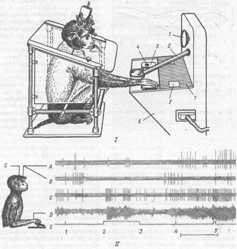 Рис. 59. Методика изучения нейронной активности мозга в тестах на краткосрочную память у обезьян;