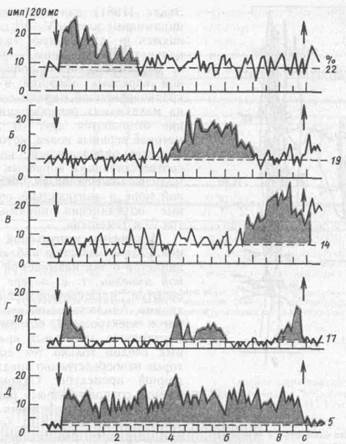 Рис. 61. Основные типы перестроек импульсной активности нейронов лобной коры в период отсрочки (по А. А. Пирогову)