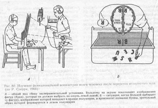 которой левое полушарие специализируется на вербально символических функциях, а правое — на пространственно синтетических (рис. 80). Для удобства приведем таблицу межполу-шарных различий при зрительном восприятии стимулов (табл. 6).
