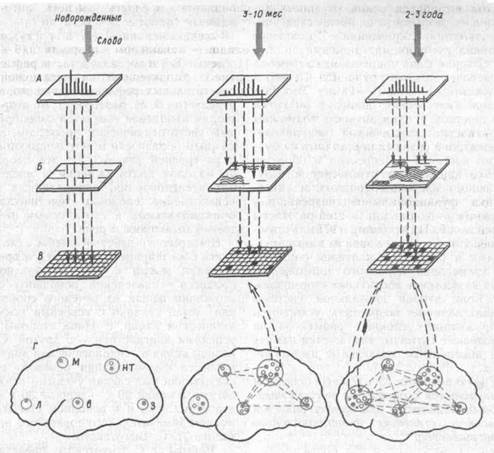 А — уровень рецептивных преобразований; Б •- уровень фирнемного перекодирования слова; В — уровень семантического анализа слова; Г — зоны мозга, участвующие в семантическом анализе слова; л лобные зоны; м — моторные, нт — нижнетеменные; в — височные; з затылочные
