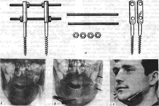 d ибший вид и детали аппарата, б в рентгенограмм bi нижней челюсти до и после наложения dimdpdTd, г — наложение