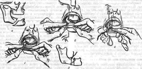 Рис. 32. Фиксация отломков обвивным проволочным швом при косом переломе тела беззубой нижней челюсти no Blak: