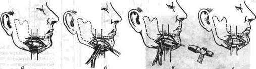 После обнажения области перелома наружную поверхность концов отломков освобождают рас-патором от надкостницы: длинный отломок на расстоянии 2.5-3 см от линии перелома и на 1 см кверху, а короткий — не более чем на 1-1.5 см (рис. 35 а). Затем в костной пластинке переднего отломка нижней челюсти бором проделывают отверстие до обнажения губчатого вещества (рис. 35 б). При этом целесообразно направлять бор в толще кости параллельно нижнему краю челюсти. Затем отломки челюсти устанавливают в правильное положение и удерживают костными щипцами. Через проделанное отверстие в губчатое вещество одного, а затем и другого отломка с помощью ювелирного молотка вводят прямоугольный или круглый металлический стержень (рис. 35 в). Глубина введения стержня в губчатое вещество каждого отломка должна составлять не менее 2 см. Конец стержня должен выступать из кости не более чем на 0.5-0.7 см (рис. 35 г). Удалять стержни рекомендуется спустя 2 месяца после остеосинтеза (не раньше).