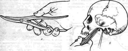 Рис 64. Инструментальная репозиция скуловой кости щипцами Дюшанжа а — щипцы наложены на скуловую кость (череп), б — щипцы наложены на скуловую кость через кожу