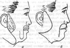 | Рис. 77. Схема устранения дефектов кожи в области ушной раковины и на верхней губе лоскутами на ножке по Bethmann-Zoltan: а — линии разрезов; 6 — наложение швов после перемешения лоскутов. |