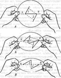 | Рис. 78. Принципы Z-пластики: А - для удлинения расстояния между точками а и б сформированы и отсепарованы два встречных треугольника (1, 2); Б - встречные треугольники (1, 2) в процессе взаимной перемены местами; В - встречные треугольники (1,2) поменялись местами, благодаря чему расстояние между точками а и и увеличилось. |