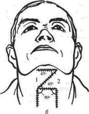 | Рис 80. Схема удлинения кожи подподбородочной области и передней поверхности шеи за счет двух пар треугольных лоскутов 45' и 90', 45' и 90" (а), 1евыи (1) и правый лоскут (2) после отсепаровки перемещены в новое положение (б) |