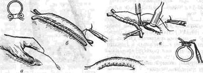 Вариант II (а с №360936) предложен в це лях уменьшения кровопотери при формиро вании длинных и широких стеблей (рис 86) Сущность его состоит в том что стебель фор мируют не из отсепарованной кожной ленты а из заранее (за 5 7 дней) прошитой кожной складки (рис 86 а б) Края кожи в области раны на донорской почве сближают сразу же после отсечения складки (рис 86 в, г) и по тому не требуется широкой отсепаровки кожи выше и ниже складки Это дает возможность во-первых, сформировать длинный и широкий стебель во-вторых свести кровопотерю во время операции к минимуму, в третьих, избежать грубых циркуляторных расстройств и нарушений трофики кожных краев раны на донорской почве что имеет большое значение для профилактики расхождения швов на сформированном стебле и последующего их мокнутия