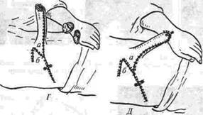 А — намечены линии разрезов; Б — отсепарован и приподнят кожный лоскут; В — треугольный лоскут о перемещен на донорскую почву у ножки стебля, на который наложены швы; Г-на место, где заимствован лоскут а, уложен аналогичный по размерам лоскут б; рана на животе полностью ущита; Д — свободный конец стебля подшит к руке.