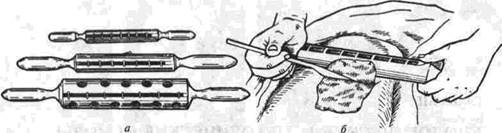 Рис. 96 Валики Н А Шинбирева для отсепаровки саженцев кожи во всю толщину а - комплект из 3 валиков различной величины, 6 — использование валика в процессе отсепаровки кожи