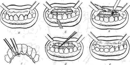 Методика операции (рис. 104) заключается в следующем: на вестибулярной поверхности делают 3-4 вертикальных разре-а десны, разделяя