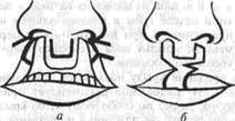 высоту губы до естественных размеров, однако многие хирурги предпочитают применять метод Миларда (Millard, рис 118, а, б, в), так как го-ризотальная часть рубца после этой операции располдгается в области естественной складки верхней губы — у основания перегородки носа — а потому менее заметна