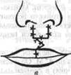 При этом сначала кетгутом накладывают швы на слизистую оболочку губы и ее мышцу, а затем полиамидной или полипропиленовой нитью — на кожу (рис. 114 в). Пластиночный шов не накладывают.