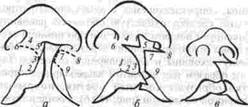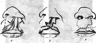 Рис 116 Схема хейлоплас-тикипоТеппвоп-Л М Обу-ховой-А А. Лимбергу при полном двустороннем несращении губы а — линия разрезов, б — перед сшиванием, в -после наложения швов