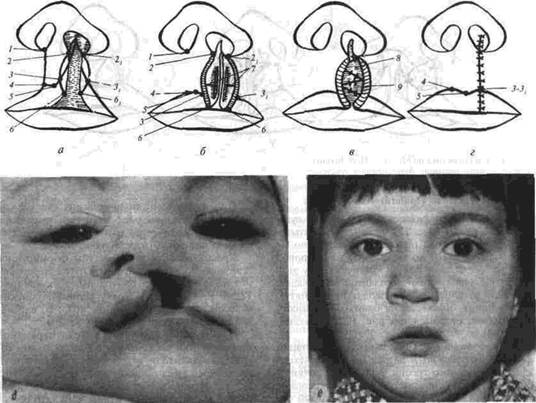 В процессе операции в первую очередь определяют степень укорочения высоты фрагментов верхней губы. Для этого измеряют расстояние между точками" 1-4 и 2-3 (рис. 121 а). Разница между величинами этих расстояний характеризует степень вертикального укорочения фрагментов губы. В зависитаости от величины этого укорочения нормализацию высоты губы достигают нанесением овальных, волнообразных или другой формы разрезов с образованием треугольных или прямоугольных лоскутов. На рис. 121 а показано использование дугообразных разрезов кожи и слизистой оболочки (линии 2-3—6 и 2,-3|—6,) для увеличения высоты губы до нормальной величины (рис. 121 б).