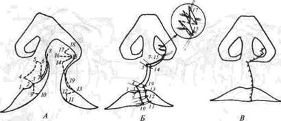 ся точка 13, от нее на красной кайме формируют треугольник 11-12-13, который при ушивании раны впишется в треугольник 3-9-10. От точки 13 ткани рассекают по границе красной каймы и кожи до точки 19, причем расстояние 13-19 должно быть равно расстоянию 3-4 на большом фрагменте От точки 19 делают разрез вверх до медиальной точки границы кожи и красной каймы по линии основания ноздри к точке 14. От нее разрез продлевают к точке 15, причем расстояние 14-15 должно быть равно расстоянию 6-7