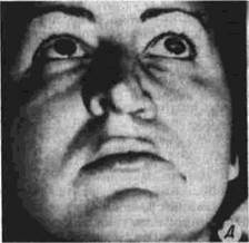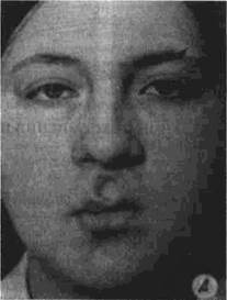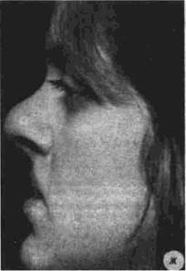 Г. Окончательный вид всех элементов верхней губы и носа и расположение послеоперационных рубцов. Д. Больная до операции. Е. Она же после операции (верхушка и крылья носа приобрели нормальную форму).