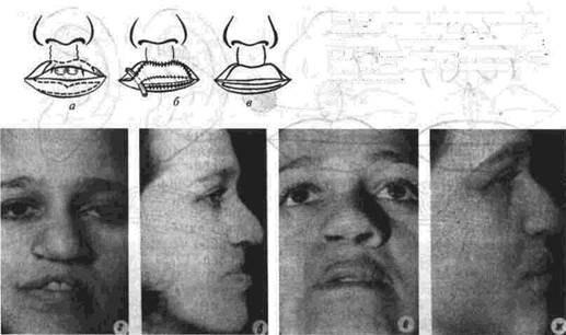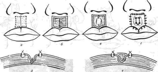 Применение этого метода показано при выраженном дефекте красной каймы, слизистой оболочки, мышечной ткани, отсутствии преддверия рта, при компенсаторной гипертрофии нижней губы и достаточно сохраненной кожной части верхней губы (г, д) Рубцове измененную часть верхней губы отсепаровывают, отворачивают вниз и используют для создания ее задней стенки и углубления свода преддверия рта (а) Дефект красной каймы верхней губы восполняют с помощью продолговатого лоскута на сосудистой ножке у угла рта, взятого с гипертрофированной нижней губы (б)