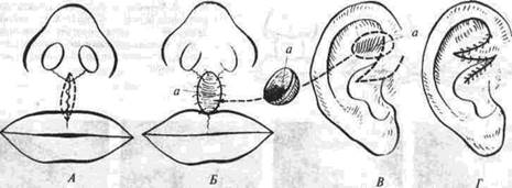 ется в следующем иссекают рубцовую ткань в центре верхней губы до ее слизистой оболочки (А), в последующем закрывая дефект кожно-хря щевым трансплантатом (Б), взятым из углубления в области ножки противозавитка ушной раковины (В) Для предотвращения деформации верхнего полюса ушной раковины производят закрытие донорского места лоскутом на ножке из завитка ушной раковины (г)