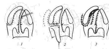 В связи с этими обстоятельствами Л. В. Харь-ковым (1986) разработана методика операции, включающая проведение следующих этапов (рис. 146, 1-3): выкраивание и отсепаровка основного нёбного слизисто-надкостничного лоскута только на большем фрагменте нёба (1), выведение сосудисто-нервного пучка из крыло-нёбного канала и отсечение лоскута от заднего края твердого нёба, тупое отделение его от крючка и освобождение от медиальной поверхности внутренней пластинки крыловидного отростка основной кости; освежение краев несращения (2), отсепаровка от костного края несращения слизисто-надкостничного лоскута на малом фрагменте (2) шириной не более чем 0.5 см, выкраивание двух треугольников в области границы твердого и мягкого нёба для Z-пластики (1, 2), освобождение мягкого нёба от заднего края твердого нёба на малом фрагменте со стороны слизистой оболочки носа, устранение дефекта нёба путем послойного наложения швов кетгутом и полиамидной нитью, выкраивание и отсепаровка на щеке языкообразного лоскута на ножке с основанием в крыло-челюстном пространстве в области большего фрагмента, перемещение его на нёбо и сшивание с дистальной стороны с перемещенным к центру и кзади основным нёбным лоскутом (3).