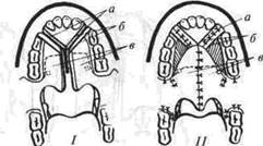 | Рис 149 Схема основных этапов операции на небе при несращении 1/4 подкласса I этап а — подлежащие деэпителизации края дефекта плотно соприкасаются друг с другом б линии послабляющих разрезов, в зона формирования задненебных лоскутов II этап а — деэпителизированные края дефекта сшиты между собой, б — раневая поверхность, образовавшаяся после сближения деэпителизированных краев дефекта в -задненебные лоскуты сшиты между собой |