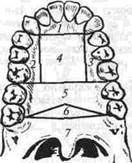 В связи с этим на небе выделяют 7 отделов (рис. 168): передний (1) — ограничен линией от 3| до |3 зубов; два боковых (2, 3) — около 543| и |345 зубов; средний (4) - между боковыми, передним и задним отделом (5), ограниченным впереди линией между 61 и |6 зубами, а сзади — изломанной под тупым углом линией от 8) до )8 зуба; «пограничный» (6) — между этой изломанной линией и линией, соединяющей середины коронок 8|8 зубов; мягкое нёбо (7) (Э.Н.Самар, 1964).
