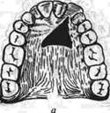 Метод Spanier-Kriemer-P. Н Чеховского применим в тех случаях, когда сквозной дефект твердого неба имеет овальную форму и не превышает 1х0.5 см. При этом, если позволяет запас тканей (рис. 172 а), на одной из боковых сторон дефекта намечают и очерчивают бриллиантовым зеленым границы слизисто-надкостничного лоскута с таким расчетом, чтобы он после выкраивания, отсепаровки и опрокидывания на 180° смог перекрыть дефект с избытком на 3-4 мм по периметру Эту периферическую полоску лоскута подвергают деэпителизации (б) при помощи фрезы; недеэпителизированной остается лишь часть, способная, повторяя форму и размер дефекта, закрыть весь его просвет после опрокидывания лоскута на 180°.