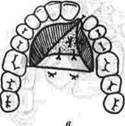 Если дефект твердого неба треугольный ч на столько велик, что одним лоскутом его перекрыть невозможно (рис 173 а), следует применить двухлоскутный способ — опрокидывание и сшивание двух лоскутов, выкроенных по краям дефекта (рис 173 б) Часть краев таких лоскутов, опрокинутых эпителием в полость носа, неизбежно должна попасть в межтканевые ниши (выше и ниже места выкраивания лоскутов) Поэтому участок свободного перекрытия двух лоскутов (т е взаимного их наложения друг на друга), а также кромки, подлежащие введению в межтканевые ниши, нужно подвергнуть деэ-пителизации фрезой (б) Недеэпителизованные участки на обоих лоскутах должны при их складывании соответствовать площади сквозного дефекта После выкраивания, отсепаровки от кости и опрокидывания на 180° лоскуты сшивают друг с другом П-образными швами (1-2). Такими же швами фиксируют края лоскутов, введенные в межтканевые ниши (в) Для более надежной и быстрой эпителизации раневую по-