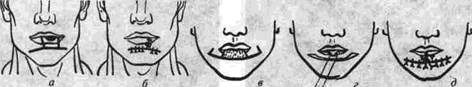 ют шов-«держалку» на слизистую оболочку и мышцы, подтягивая которые сближают и смещают лоскуты к средней линии. При этом происходит раскрывание углов в области дополнительных разрезов («кочерги») (г). Слизистую оболочку губ и щек фиксируют кетгутовыми швами, начиная со щек и постепенно продвигаясь к средней линии, сначала с одной стороны, затем — с другой. На мышцы накладывают швы кетгутом, на кожу — капроном. При зашивании раны за счет раскрывания углов «кочерги» получают такой прирост тканей, который необходим для закрытия дефекта губы без натяжения в швах (д). Образующиеся на щеках небольшие выступающие конусы убирают, что улучшает косметический эффект операции непосредственно на операционном столе.