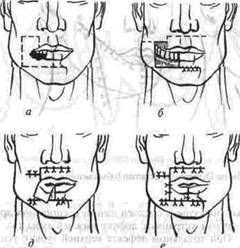 края дефекта иссекают, чтобы придать ему более определенную форму, обеспечить лучшую сраста-емость с лоскутом (рис. 188 о). Посредством дополнительных линейных разрезов и отсепаровки краев дефекта добиваются некоторого его уменьшения за счет перемещения и ушивания соседних тканей (б, в). Выкраивают лоскут на ножке соответствующих размеров и формы (на противоположной губе) (в), перемещают его в область дефекта (г, д) и послойно подшивают (е). Спустя 14-17 дней питающую ножку отсекают, красную кайму в области угла рта моделируют и тщательно ушивают.
