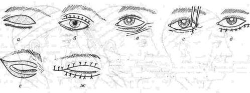 | Рис 224 Схема устранения складок верхних (а — до операции, б— после нее), нижних (в — до операции, г — в процессе операции, д - после нее) и обоих век одномоментно (е - складки иссечены, ж - после операции) по Г В Кручинскому |