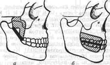 а - направление линии рассечения костного сращения между передним краем ветви челюсти, венечным отростком и бугром, б — линия рассечения костных сращений между пьвеолярными отростками обеих челюстей
