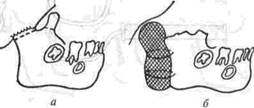 Операция состоит в том, что после выделе ния из рубцов и остеотомии (рис 245 а) ветвь челюсти перемещают в правильное положение, а затем закрепляют ее трансплантатом из алло генного хряща (б), который подшивают вдоль заднего края ветви