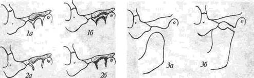 2) отсутствует головка челюсти и внутрисуставной диск а — без патологических изменений, б—с воспалительно-дистрофическими изменениями в тканях.