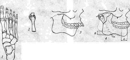 | Рис 255 Способ восстановления височно-нижнечелюстного сустава аутосуставом стопы по В А. Маланчуку (а.с. №1426556) 1 -4 - этапы операции А - степень перемещения челюсти вперед. В - степень удлинения ветви челюсти |