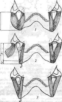 Рис 256 Способ лечения анкилоза ВНЧС и микрогении по В А. Маланчуку, И Г Скворцовой (ас №1556665) Удлинение мышц составляет 0 15-020 от их исходной длины, после механотерапии удлинение составляет 0 30 0 33 А -пооперационная длина жевательных мышц В — то же после операции С - удлинение мышц 1-3-этапы операции