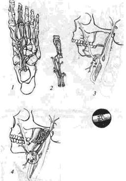 Рис 257 Способ восстановления ВНЧС аутоплюснефалан-говым суставом (ПФС), перенесенным на микрососудистых анастомозах по В А Маланчуку (ас № 1595479) 1 -4 -этапы операции