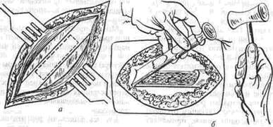 а - рассечение наружной, окружающей ребро пластинки с помощью остеотома М. В. Костылева; б - удаление наружной