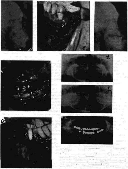 | Рш. 309 Иллюстрация возможности применения мини-пла стинок а рентгенограмма костей больного с протрузией альвеолярного отростка нижней челюсти, Ь — осуществлена сегментарная остеодктомия ретротранспозиция выступавшего альвеолярного отростка и фиксация его с помощью мини пластинки в правильном положении с — рентгенограмма того же больного после операции, d — состояние атрофированного альвеолярного отростка больного до операции е — альвеолярный отросток его увеличен за счет пересадки аутореберного трансплантата зафиксированного нини пластинкой, f — рентгенограмма альвеолярного отростка после операции g — пораженный амелобластомой участок челюсти замешен ауготрансплантатом (из подвздошной кости), который закреплен мини пластинкой с шестью винтами h — рентгенограмма нижней челюсти этого бального после аутогоансплантации (О Leibinaer 1993) |