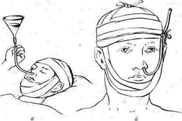 | Рис 310 Кормление больного с челюстно-лицевои травмой из воронки (поильника и т п ) через зонд, введенный в пи щевод а - положение зонда во время кормления, 6 — после кормления (по Г М Иващенко) |
