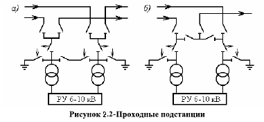Представляет собой радиально-магистральную сеть, построенную по принципу наименьшей суммарной длины линий электропередачи. Большинство линий двухцепные. Для подстанций ПС5, ПС4, ПС3, ПС2 (рис 2.1 б) принимаем тупиковую подстанцию (рис 2.1 а) , ПС6 ПС1 проходную (рис. 2.2 б).