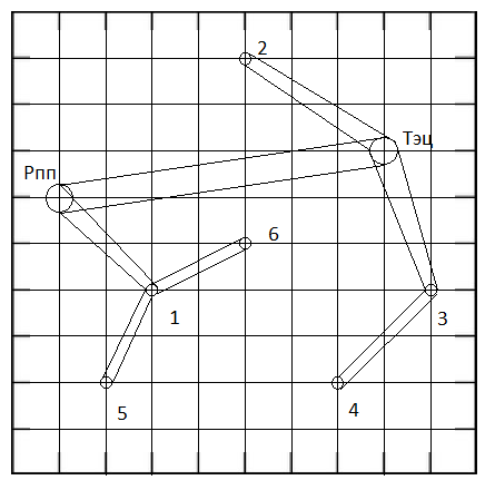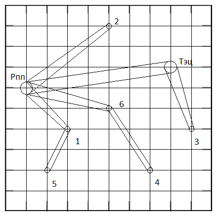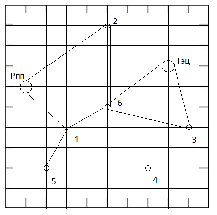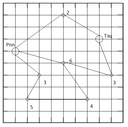 Представляет собой кольцевую сеть, построенную по принципу наименьшей суммарной длины линий электропередачи. Для подстанций ПС 1, ПС2, ПС3, ПС6, ПС5 принимаем проходные кольцевые подстанции, ПС4 тупиковую (рис. 1).