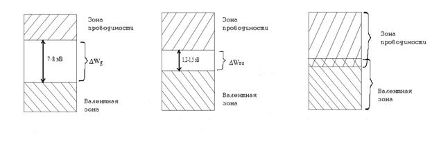 В соответствии с рисунком, в зависимости от ширины запрещенной зоны можно построить энергетические диаграммы для трех типов веществ.