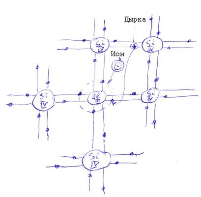При этом три валентных электрона примеси образуют ковалентные связи с тремя из четырех соседних атомов кремния. Одна из ковалентных связей остается незавершенной, образуя вакантное энергетическое состояние. Атому примеси для заполнения вакансии требуется дополнительный электрон для образования прочной восьмиэлектронной оболочки. Этот электрон отбирается от одного любого атома кремния. Атом примеси, отобравший электрон из ковалентной связи решетки полупроводника, становится неподвижным отрицательным ионом. На том месте в основной решетке, откуда к атому примеси пришел электрон, образуется дырка. Она добавляется к собственным дыркам полупроводника, вызванным термогенерацией, поэтому проводимость полупроводника становится преимущественно дырочной.